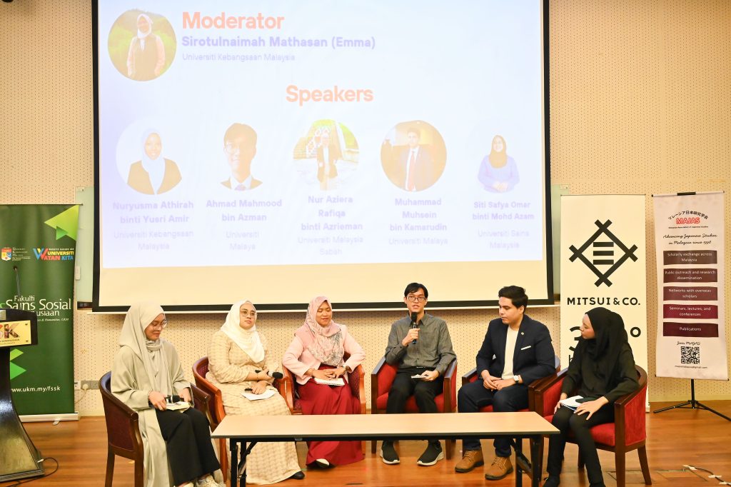 A group of five students ranging from undergraduates to postgraduates each shared their experience on how they discovered Japanese Studies. They also shared on the lack of exposure of Japanese Studies as compared to other studies as well as limitations in resources. They concluded by posing several questions to the academicians on how to encourage students to be more involved in the Japanese Studies sphere.
